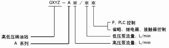 如采用A系列,高压流量为2.5L/min;高压压力为31.5MPa,低压供油压力为0.4MPa;而低压供油量为40L/min的高(低)压稀油站,采用PLC控制的则按如下方法标注:GXYZ-A2.5/40.P |
